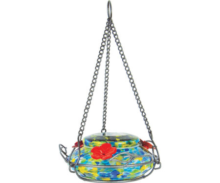 The Illuminated Hummingbird Feeder utilizes a beautiful, thick hand-blown glass base and lid holding up to 18 oz. of nectar. The LED light transforms this feeder into a beautiful decorative nighttime lantern for your landscape. It features Easy Fill & Clean with a 3" wide opening and silicone gaskets for Leak Free fit. All glass, silicone, and flower ports are dishwasher safe. This feeder comes with a decorative powder-coated basket that has three leaf-shaped perching rings.